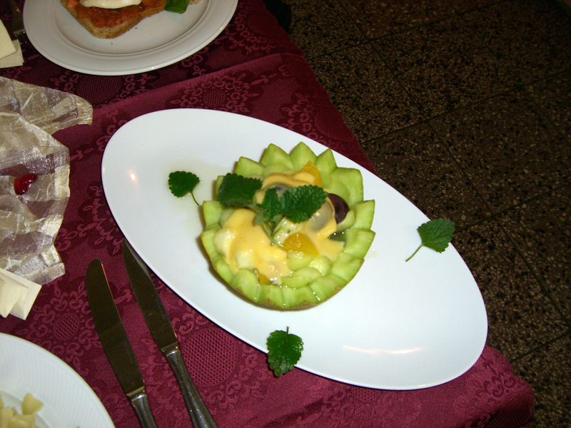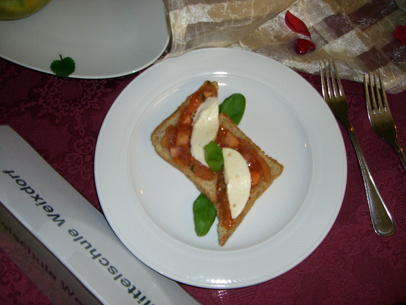 Gleich zu Beginn des Wettbewerbes zeigten wir unser Können an Topf und Pfanne. Unser kleiner Wirbelwind Vicky legt voll los und zauberte der Jury ein Bruschetta mit Tomaten und Basilikum von einem anderen Stern. Unser Starkoch Mario begeisterte mit Lachs im Sahne-Spinatnest auf Tagliatelle. Damit war der Sieg schon in greifbare Nähe gerückt. Zum Schluss lieferte Cookie Steve mit einem unwiderstehlichen Obstsalat in Melonenkörbchen mit Sabayonehäubchen. Als letztes kam unsere dekorative Ute mit ihrer Weltklasse Tischdekoration.
