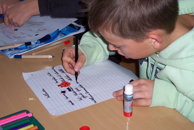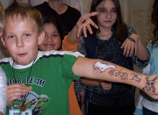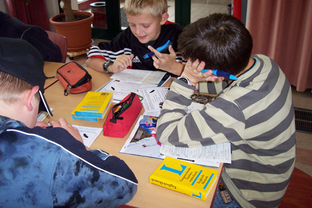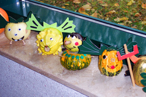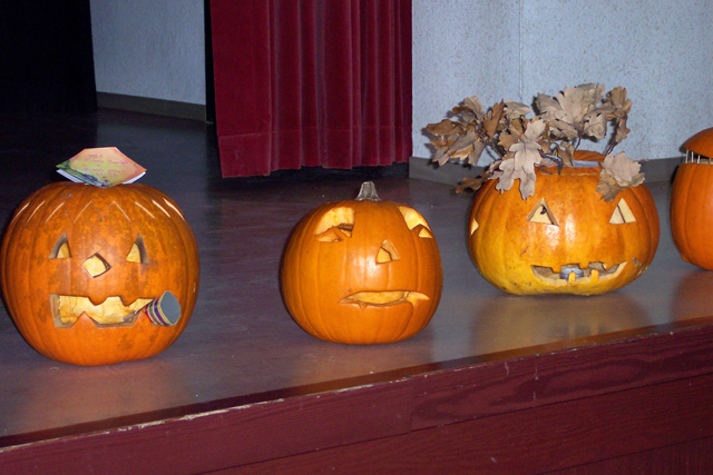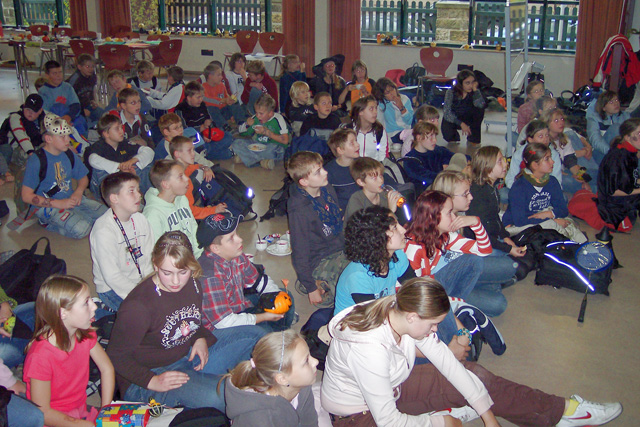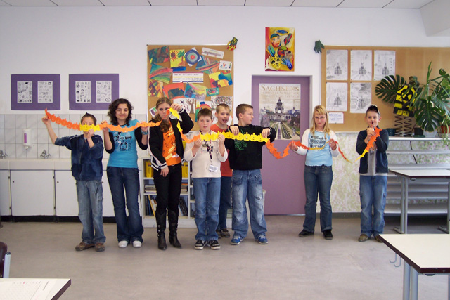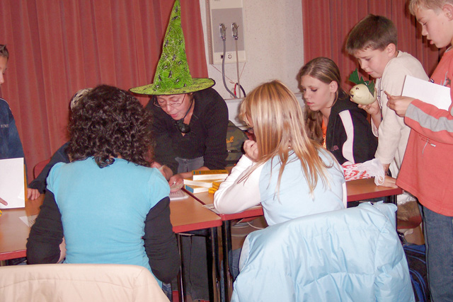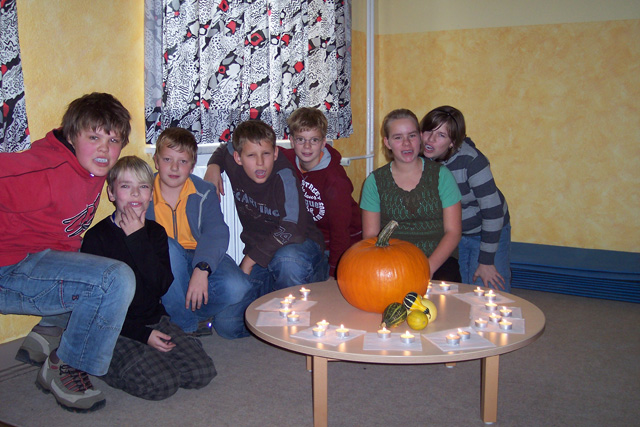 Am 30.10. 07 fand wieder das Halloweenfest für die fünften und sechsten Klassen statt. An verschiedenen Stationen wurde rund um Halloween gerätselt, gebastelt, geschminkt und gesungen. Die Schüler dekorierten leckere Muffins, knüpften die längste Kürbisgirlande und pusteten Papier- Fledermäuse um die Wette. Spezielle englische Vokabeln gehörten auch zum Programm. Natürlich wurde auch die Sieger des Wettbewerbs um den schönsten und schwersten Kürbis gekürt. Am meisten Spaß machte jedoch das Verwandeln von Zierkürbissen jeglicher Art in gruslig-lustige Fledermäuse. Am Ende des Halloweenfestes war für das leibliche Wohl gesorgt : Es gab für alle fleißigen Teilnehmer hausgebackenen Gespensterkuchen, Würstchen im Schlafrock und ein schauriges Dessert.