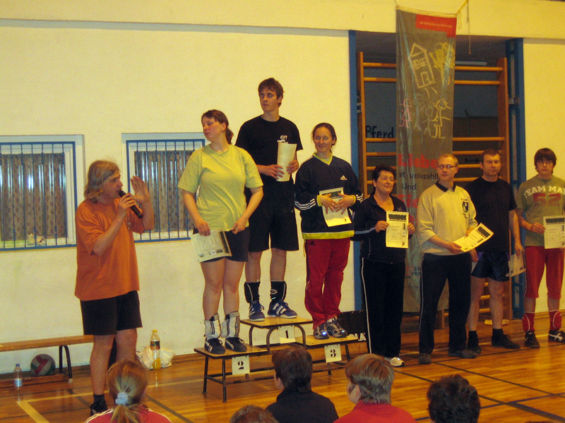 Den Abschluß bildete das Volleyballturnier. Sieben Mannschaften stritten um Punkte und gute Platzierungen. Den Pokal holten sich mit Kamfpfgeist, schönem Zuspiel und scharfen Angriffsschlägen die Schüler vom Gymnasium Klotzsche.